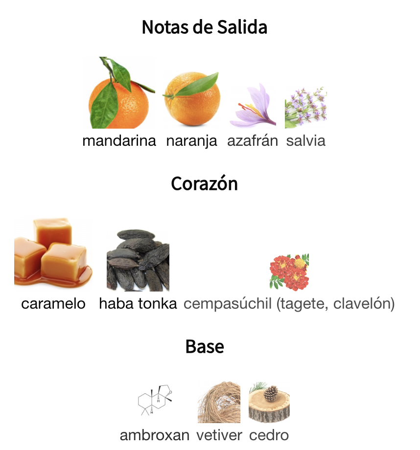 Desde su salida, destaca por una explosión fresca de mandarina y naranja, acompañada por el carácter aromático del azafrán y la salvia, que aportan profundidad y masculinidad.